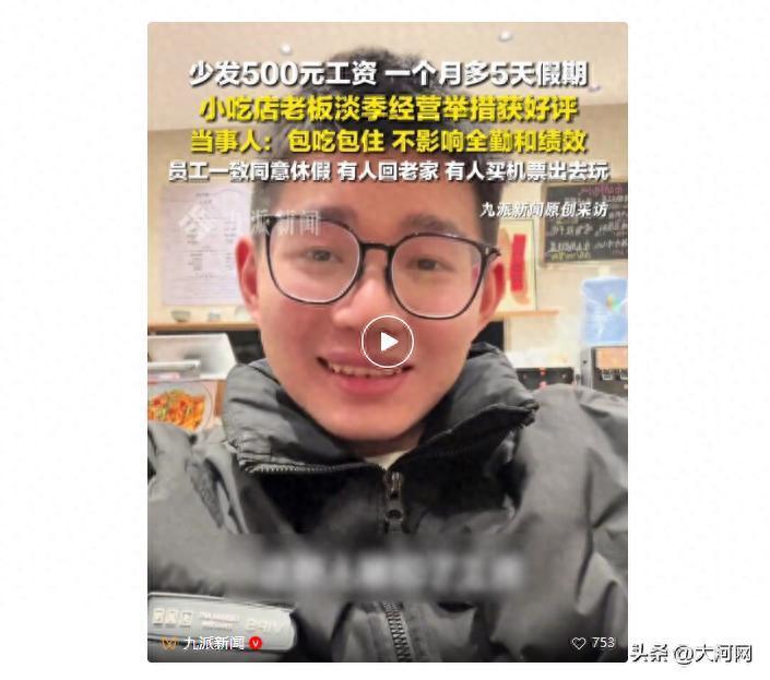 近日,武汉一家小吃店雇主的计较举措——多休5天假,激发关爱并获取颇多好评。他在视频中示意开yun体育网,多休5天假对应少结算500元工资,但保证住宿待遇照常享有,不影响全勤奖和绩效工资的派发。