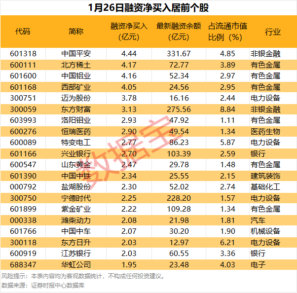 具体到个股,1月26日获融资净买入1亿元以上的有53只,其中,6只股融资净买入额超3亿元。中国吉祥融资净买入额居首,当日净买入4.44亿元,其次是朔方稀土、中国铝业,融资净买入金额永别为4.17亿元、4.16亿元,融资净买入金额居前的还有西部矿业、迈为股份、东方钞票等。