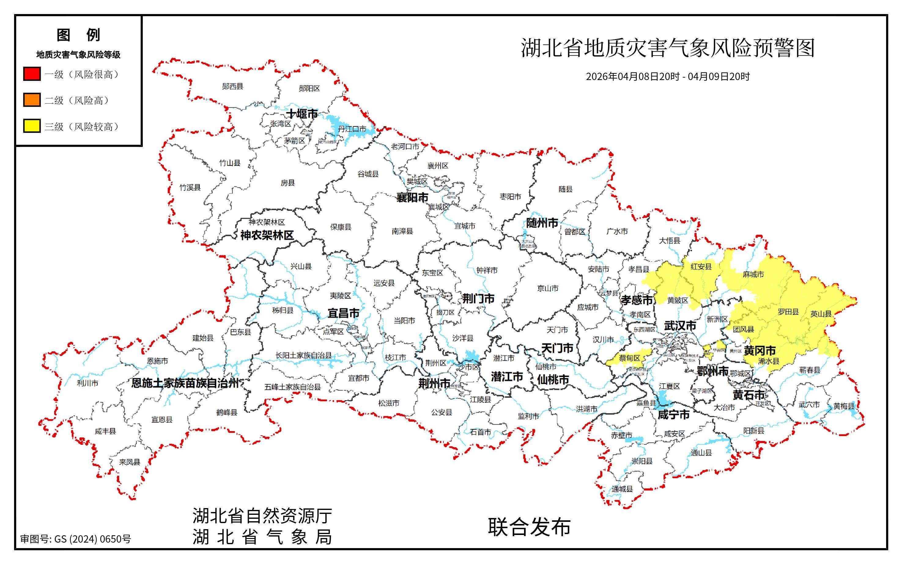 湖北日报讯(记者刘胜)4月8日晚,湖北省当然资源厅和湖北省征象局聚拢发布《地质灾害征象风险预警》。2026年04月08日20时-2026年04月09日20时,预测武汉(黄陂区北部和中部、新洲区东北部、蔡甸区中东部和西部)、孝感(孝昌县东部)、鄂州(华容区东北部、葛店开导区)、黄冈(红安县中部和南部、麻城市大部、罗田县、英山县、团风县北部和中部、浠水县大部、蕲春县东北部)以过甚他强降水区域发生坍弛、滑坡、泥石流的风险较高。请贯注贯注。