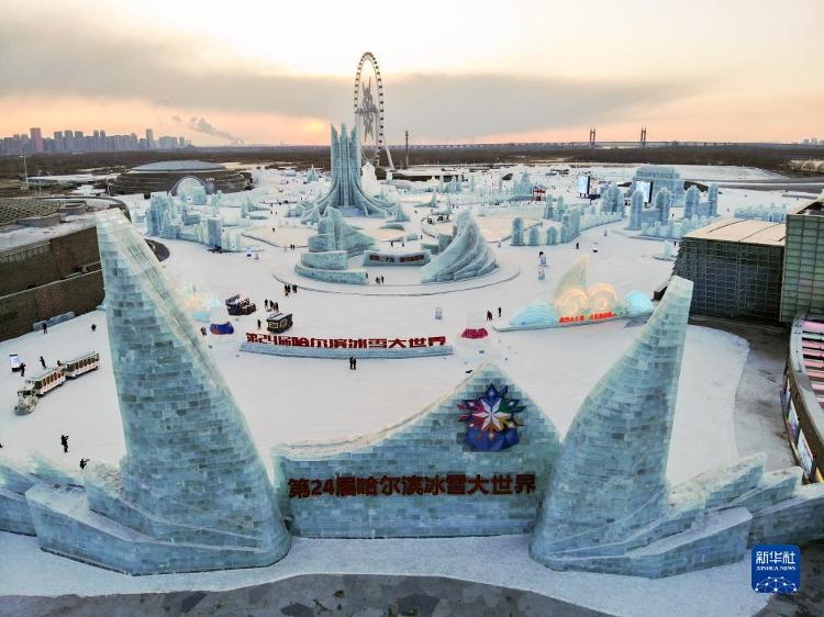 12月17日,旅客在哈尔滨冰雪大宇宙园区游览(无东说念主机像片)。当日,第24届哈尔滨冰雪大宇宙迎来试开园。新华社记者 张涛 摄