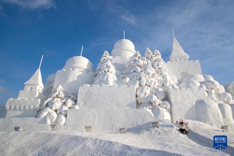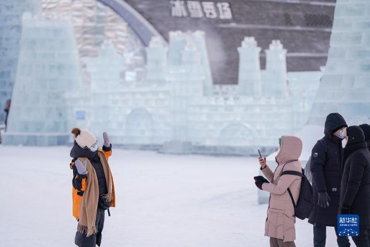 12月17日,旅客在哈尔滨冰雪大宇宙园区游览、拍照。当日,第24届哈尔滨冰雪大宇宙迎来试开园。新华社记者 王松 摄